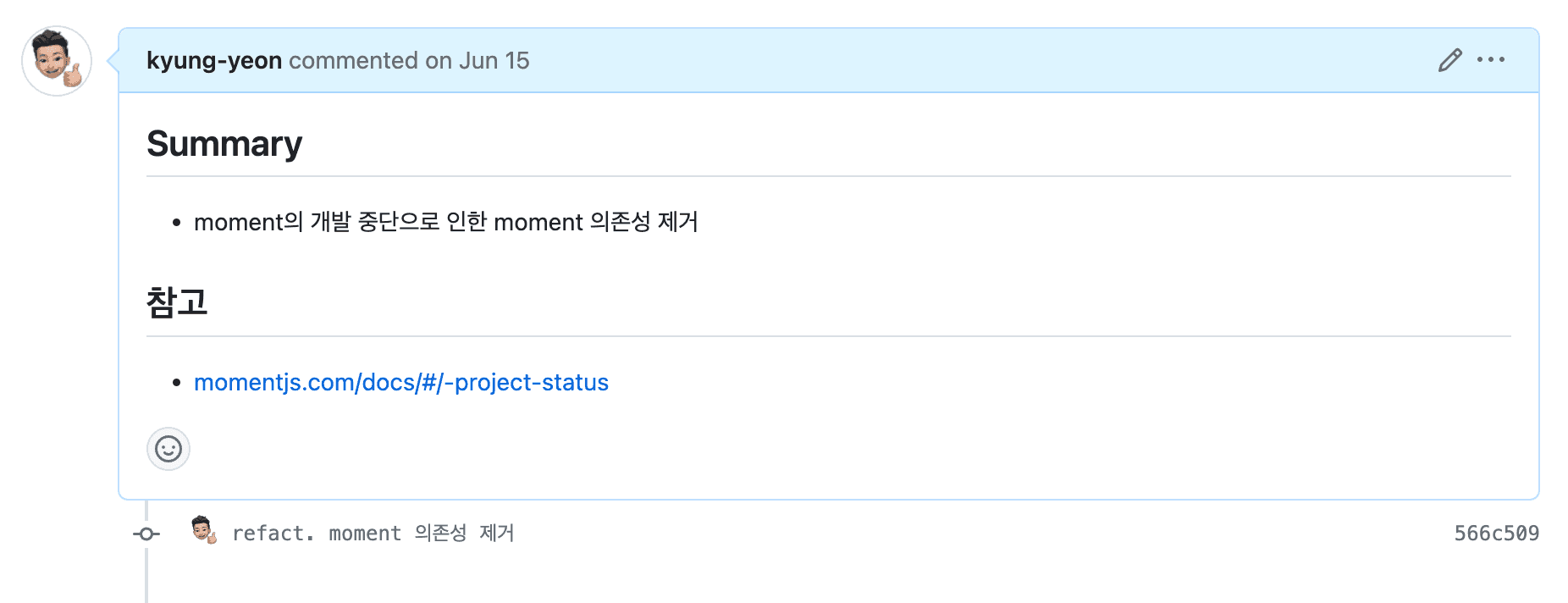 - moment 를 사용하는 등 오래된 npm이 새로운 프로젝트에 세팅되어있다.