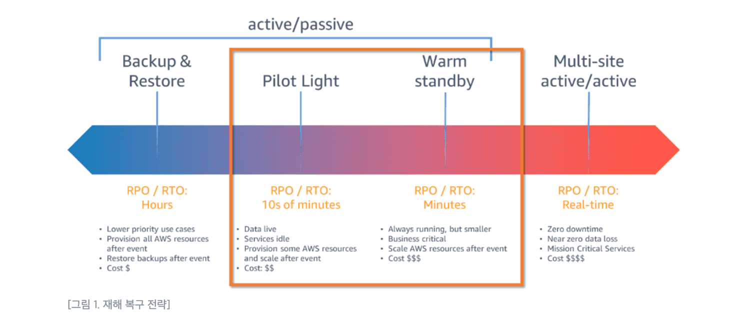 - 복구 속도 → multi-site > warm standby > pilot light > bankup