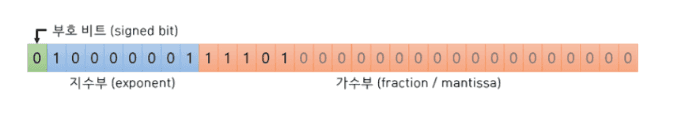 32비트 기준으로 부호비트 1자리, 지수부 8비트 그리고 가수부 23비트로 구성된다.