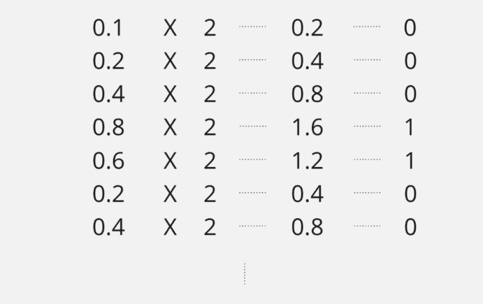 2씩 곱하고 몫을 남겨두고 나머지를 다시 2를 곱하는 방법의 반복으로 2진수를 구할 수 있다.