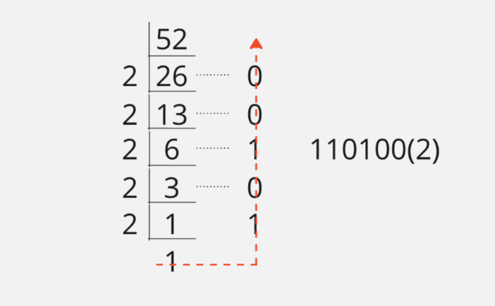 52를 이진수로 변환하면 그림과 같은 순서로 110100 (2) 로 표현할 수 있다.
