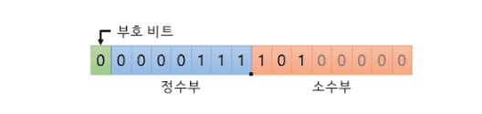 예를들어 16비트 체계에서 고정 소수점 형식은 앞에서부터 순서대로 부호비트 1비트 정수부 7비트 마지막으로 소수부 8비트로 구성되어 있다.