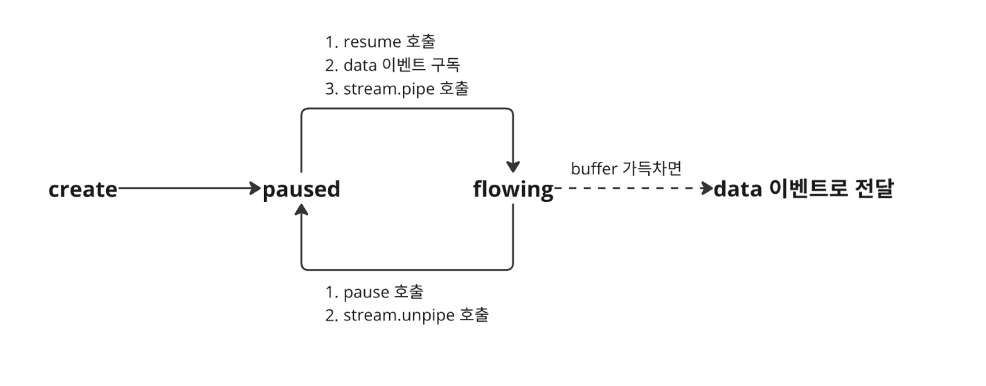 - Flowing 모드: 데이터가 읽혀지고 buffer에 가득 찬 데이터를 ‘data’ 이벤트를 통해 전달합니다.