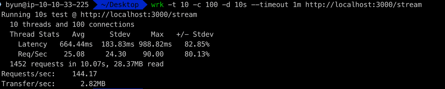 wrk -t 10 -c 100 -d 10s --timeout 1m http://localhost:3000/streamstream을 사용하면 초당 144개 처리로 이전보다 더 빨라진걸 확인할 수 있습니다.