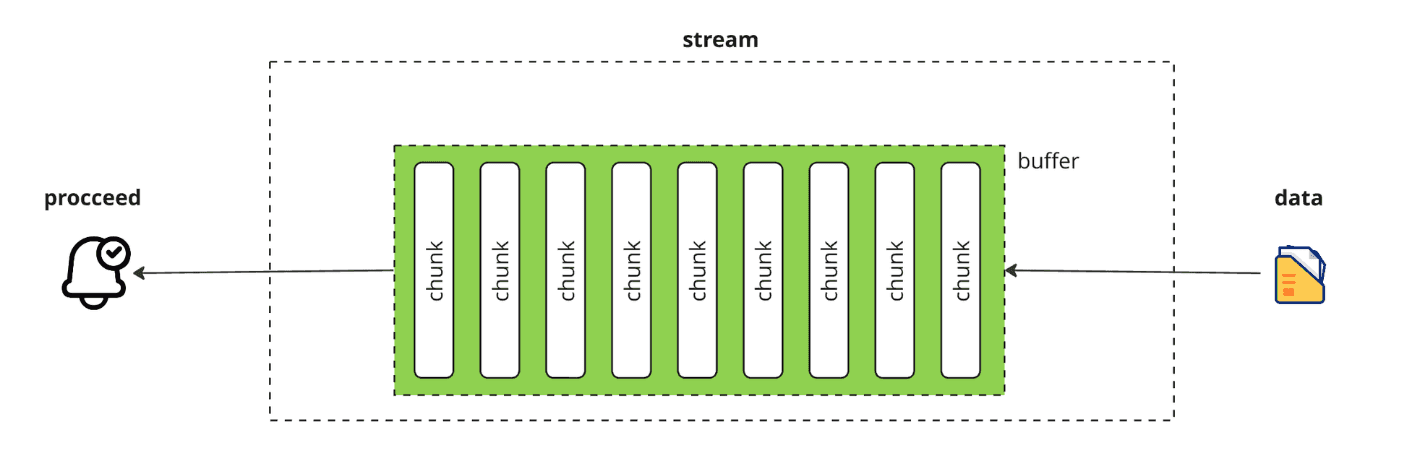 stream 을 사용하면 chunk 로 쪼개진 데이터를 buffer 에 모았다가 buffer 의 사이즈가 꽉 차면 데이터를 전달하게 됩니다.