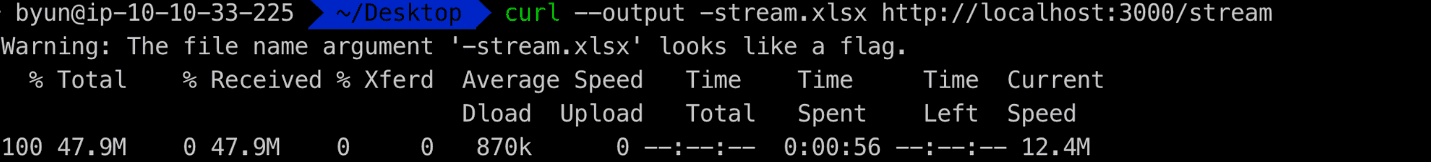 curl --output -stream.xlsx http://localhost:3000/streamquery time: 1.41ms