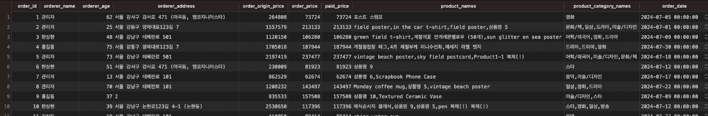 GROUP BY `o`.`orders_id`, `u`.`name`, `u`.`age`, `u`.`address`, `o`.`origin_price`, `o`.`price`// 1. 데이터 조회