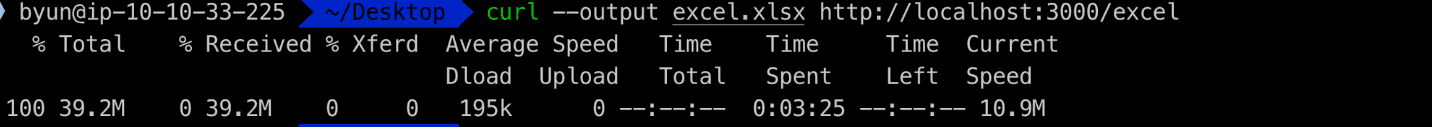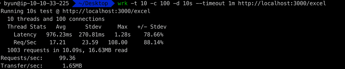 wrk -t 10 -c 100 -d 10s --timeout 1m http://localhost:3000/excel초당 99개의 요청을 처리할 수 있었습니다.