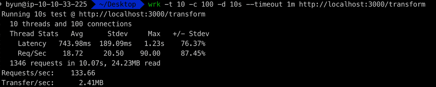 wrk -t 10 -c 100 -d 10s --timeout 1m http://localhost:3000/transformtransform을 사용했을 때 초당 133개의 요청을 처리할 수 있었으며, 이는 동기 방식보다는 빠르지만 스트림 방식보다는 약간 느린 결과입니다.
