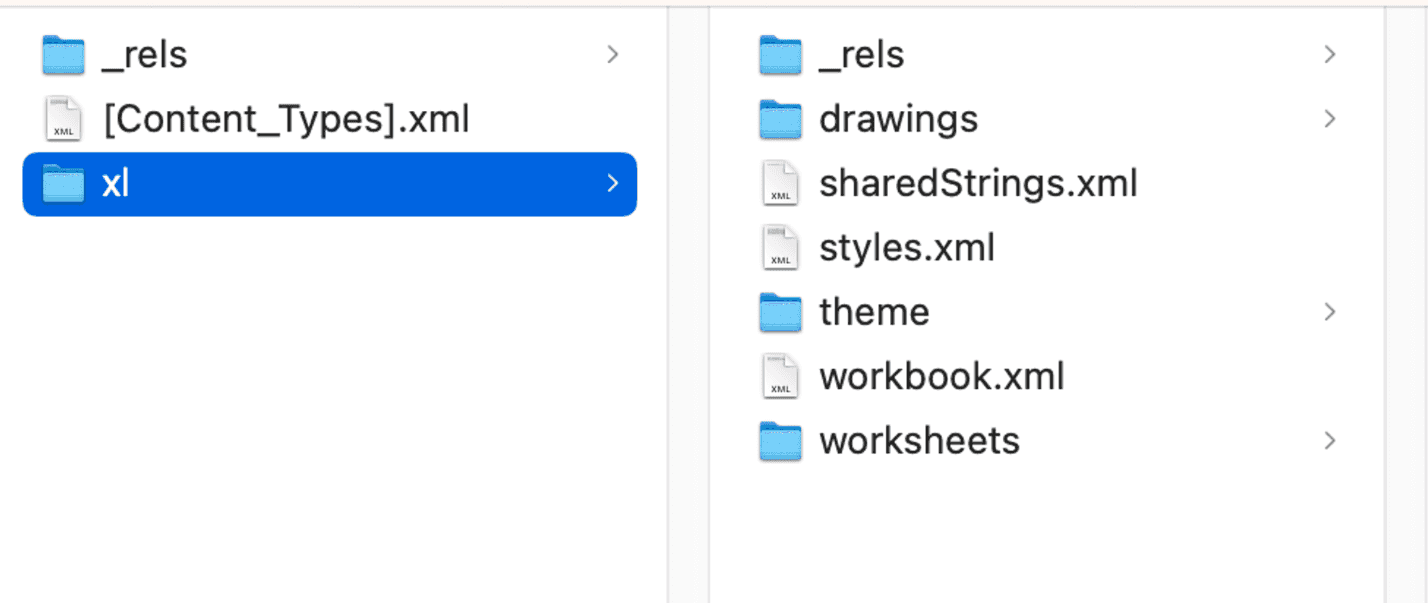 xlsx 하나를 구성하기 위해서 수많은 파일들이 존재하는 걸 볼 수 있습니다.