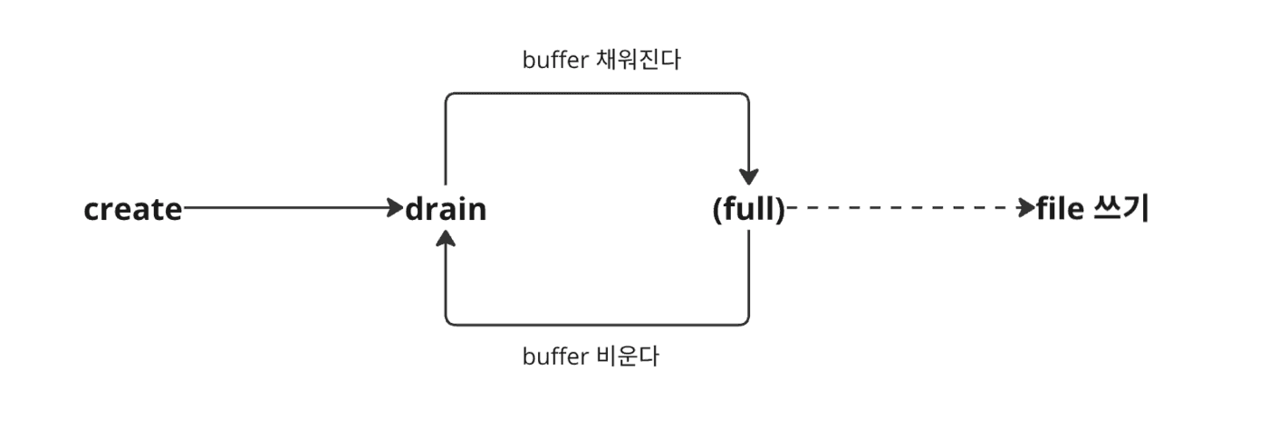 파일이 모두 쓰여지고 나면 drain 이벤트를 발행하고 drain 이벤트가 발행되면 다시 데이터를 buffer 로 받아들이게 됩니다.