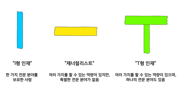 T자형 인재라는 표현을 요즘 자주 듣는다. 많은 회사와 팀이 T자형 인재를 선호하는데, 이는 다양한 분야에 대한 지식과 더불어 특정 분야에 깊이 특화된 역량을 가진 사람을 의미한다. 큰 범주로는 프론트엔드와 백엔드 개발자로 나눌 수 있으며, 양쪽 모두를 이해하지만 한쪽에 더 전문성을 지닌 개발자가 이에 해당한다. 예를 들어, 백엔드의 전반적인 지식을 갖추면서도 특정 영역, 예를 들어 검색엔진 최적화에 특화된 개발자가 있을 수 있다.