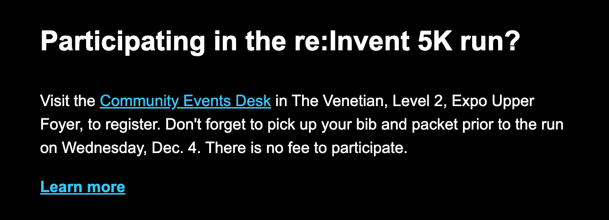 또한 re:Invent 기간 중 1회 마라톤을 개최한다. 5Km이고 완주하더라도 특별한 부상을 제공하지는 않는 것 같다. 다만 이벤트 기간동안 라스베이거스를 가로지르며 달리는 재미를 느껴볼 수 있다고 한다. (아침 6시에 출발이라 난 참여하지는 않았다..)