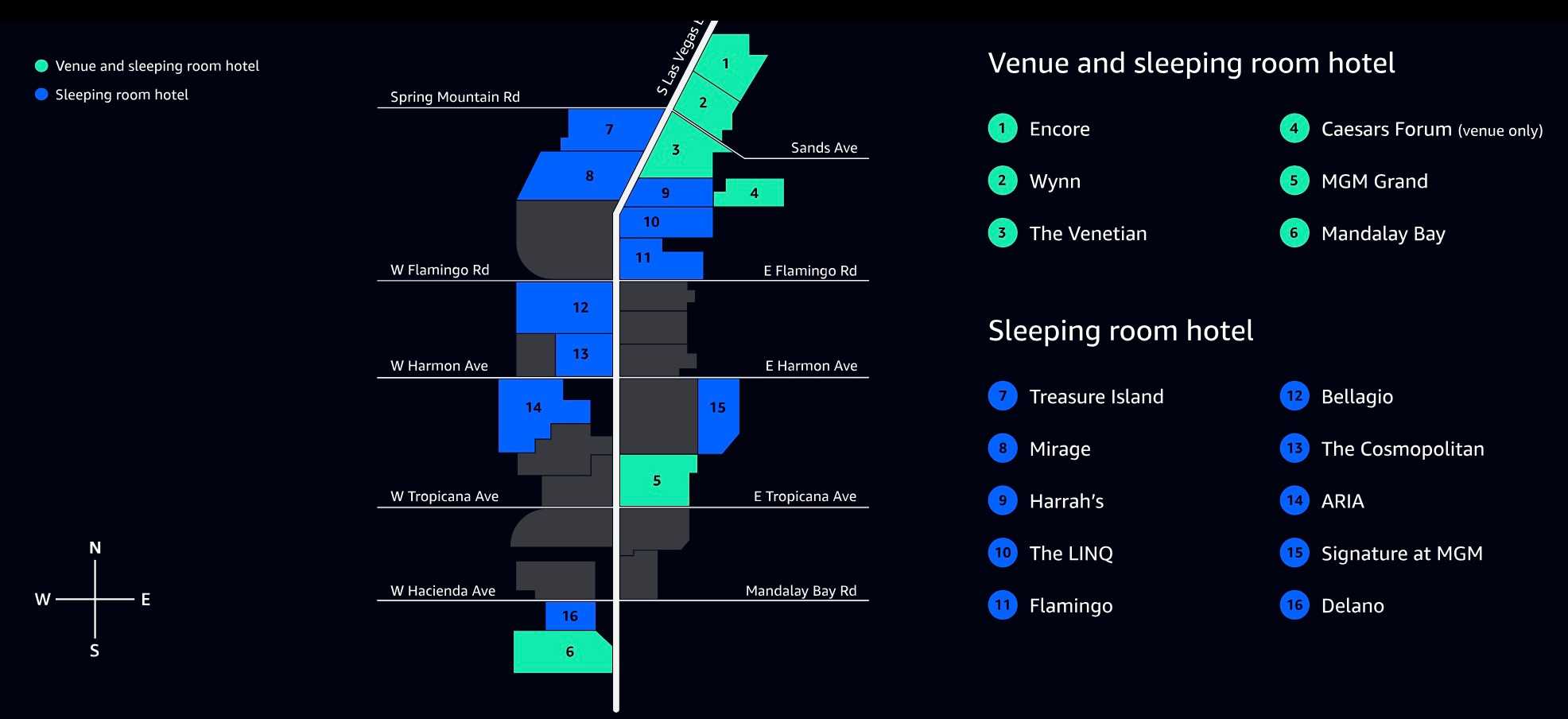 re:Invent 는 미국 라스베이거스의 시내 중심에서 진행된다. 무려 6개의 호텔을 빌려 진행하는데 한 개의 호텔 크기는 한국의 웬만한 마트 크기였다.(트레이더스, 스타필드 등) 어쩌면 더 클지도 모르겠다. 호텔 입구에서 AWS 세션장 까지 걸어가면 10~15분 정도는 걸어가야 할 정도였다.