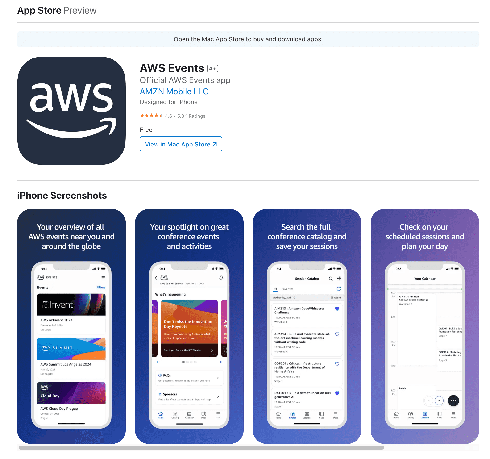 AWS 에서 수많은 세션이 있는데 가장 중요한건 사전에 예약해야 한다. iOS, AOS 모두 마켓에서 다운받을 수 있고 AWS 계정으로 로그인하면 세션에 자리를 미리 예약할 수 있다.