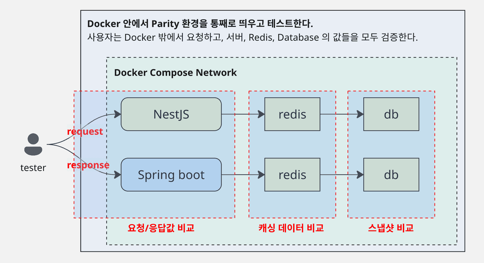 테스터의 api 요청에 대해 서버 각각으로 요청을 보내고 요청 -> redis -> db -> 응답값 전 구간의 스냅샷을 비교하는 형식이다.