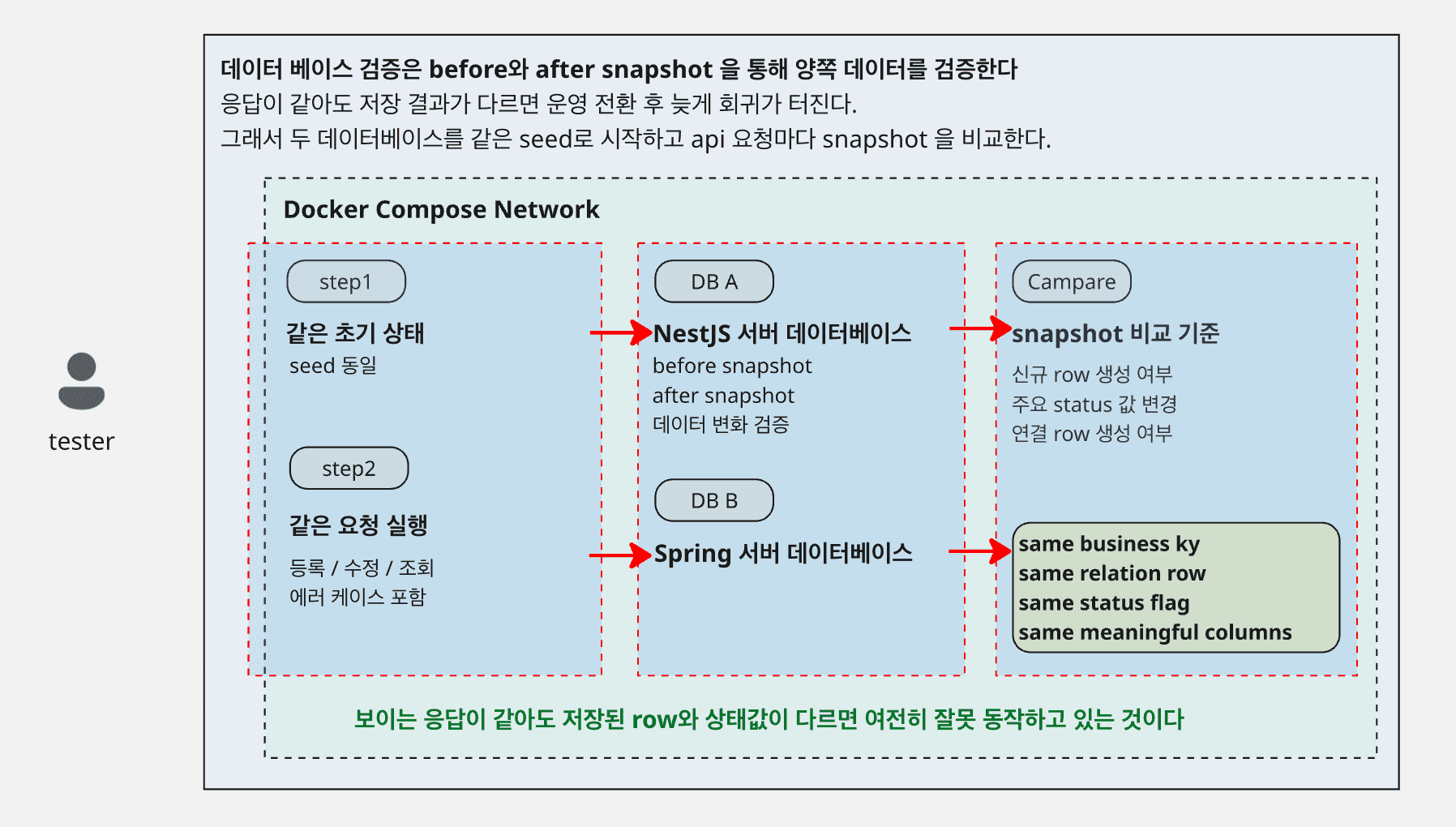 즉, 응답만 비교한 것이 아니라 각 서버가 남긴 Redis 상태와 Database snapshot도 따로 읽어서 맞춘다.