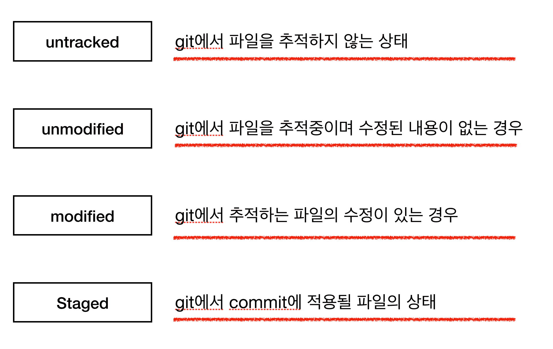 - untracked : 파일 추적이 되지 않는 상태를 가르킨다.