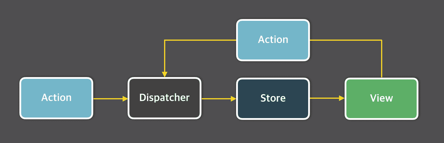 데이터의 흐름이 단방향이기때문에, View는 Dispatcher에 Action을 보낼 수 있고 역시 Dispatcher는 동일하게 Action을 Store의 수정을 통해 View에 반영된다.