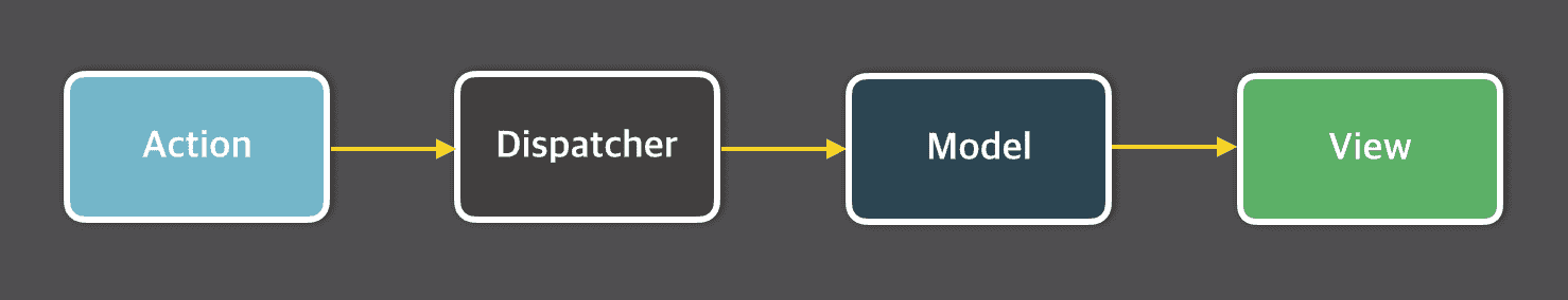 어떠한 Action이 발생하였을 때 Dispatcher가 Action을 관리하고 Dispatcher의 통제하에 Store에 있는 데이터를 조회/수정 등의 작업이 이루어진다. 그리고 View에 반영되는 구조이다.