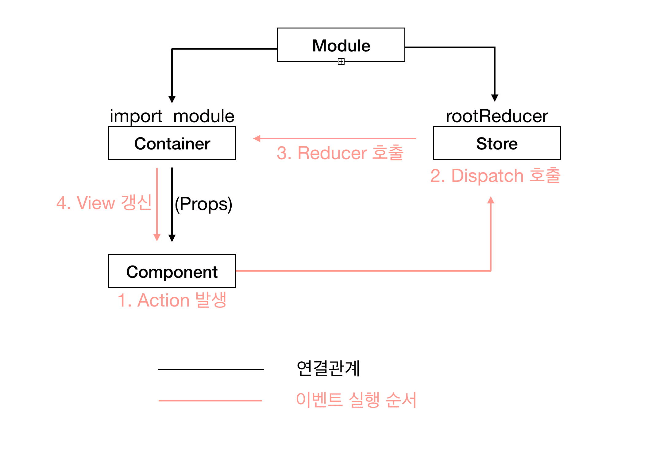 정리하자면 Module, Store, Container, Component 가 실행되는 동작 순서를 아래 그림과같이 정리해보았다.
