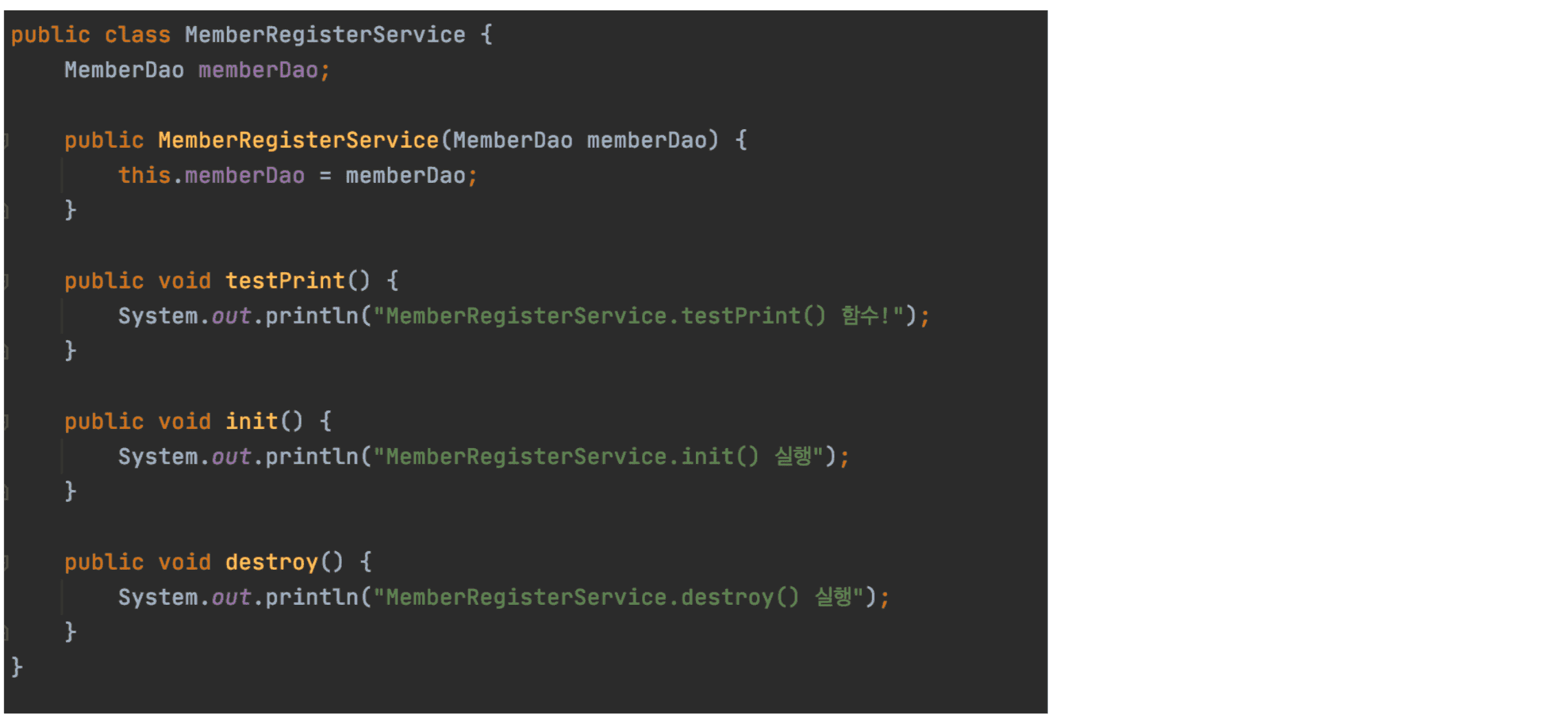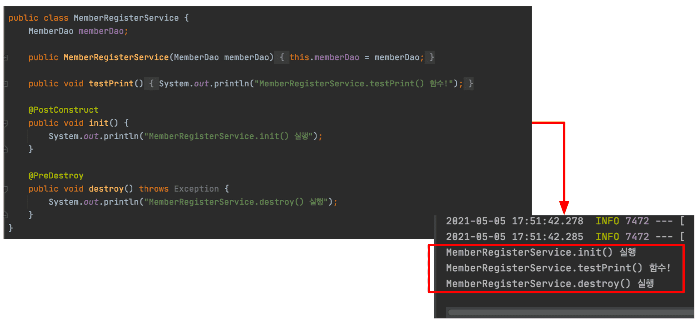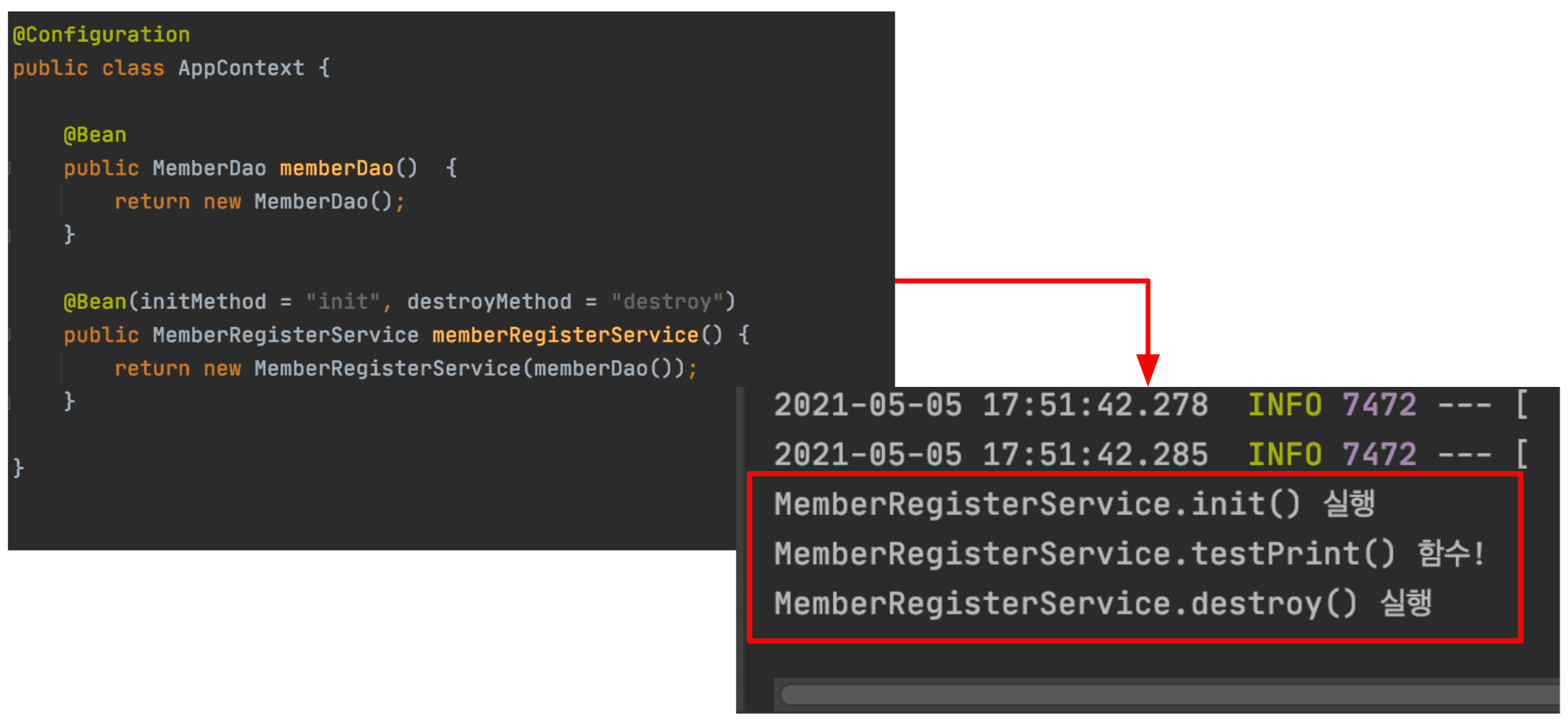 이렇게 @Bean에 호출할 함수를 지정하는 방식은 프로젝트 내에 코드를 가지고있지 않은경우. 예를들어 외부 라이브러리를 가져다 사용했을 경우 외부 라이브러리의 초기화, 소멸을 여기서 호출해줄 수 있습니다.
