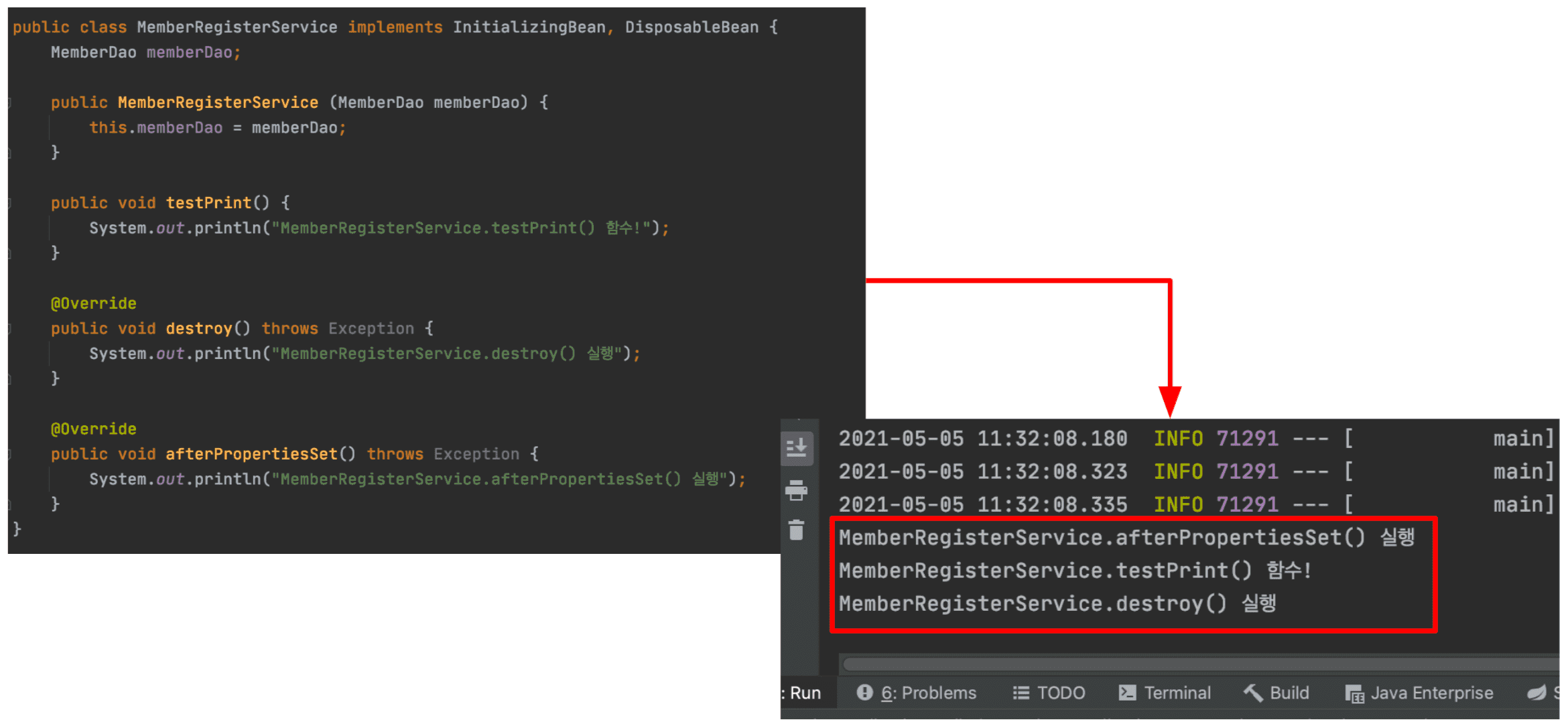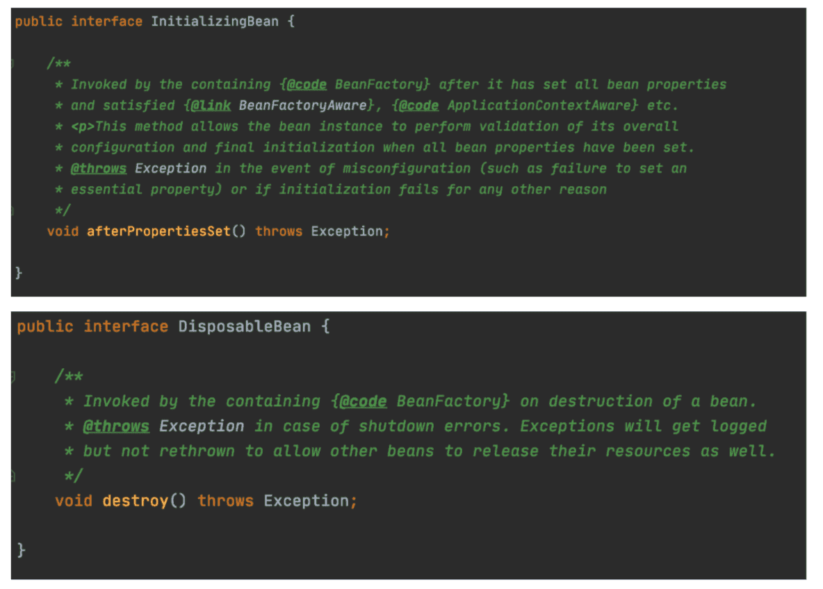 두 개의 인터페이스를 상속받아 aterPropertiseSet, destory 함수를 override하여 재정의한 후 필요한 처리를 할 수 있습니다.