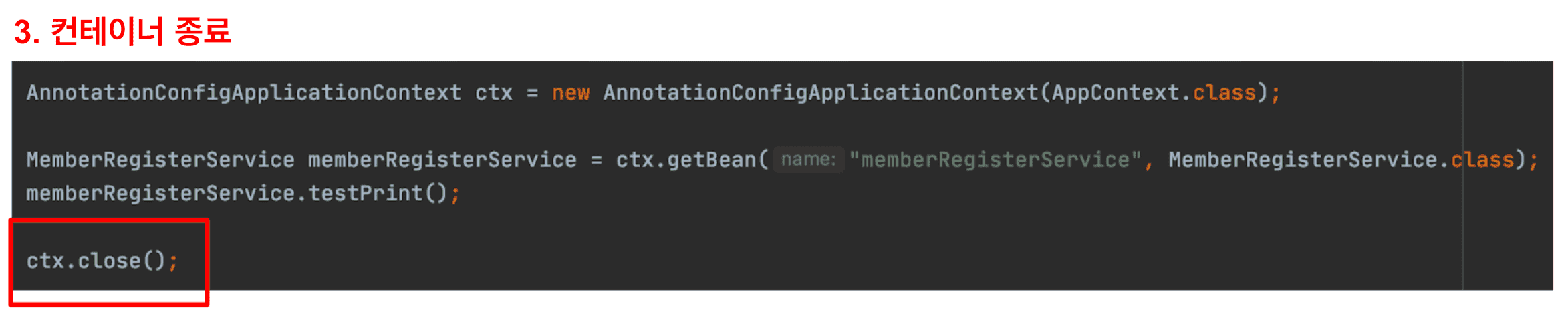 Bean의 사용이 끝나면 close를 통해 컨테이너의 소멸처리가 됩니다.