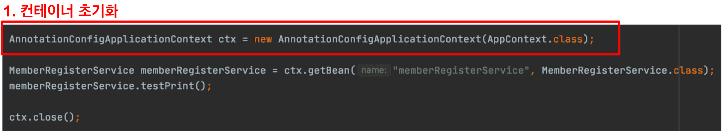 AnnotationConfigApplicationContext를 통해 컨테이너 초기화가 됩니다.