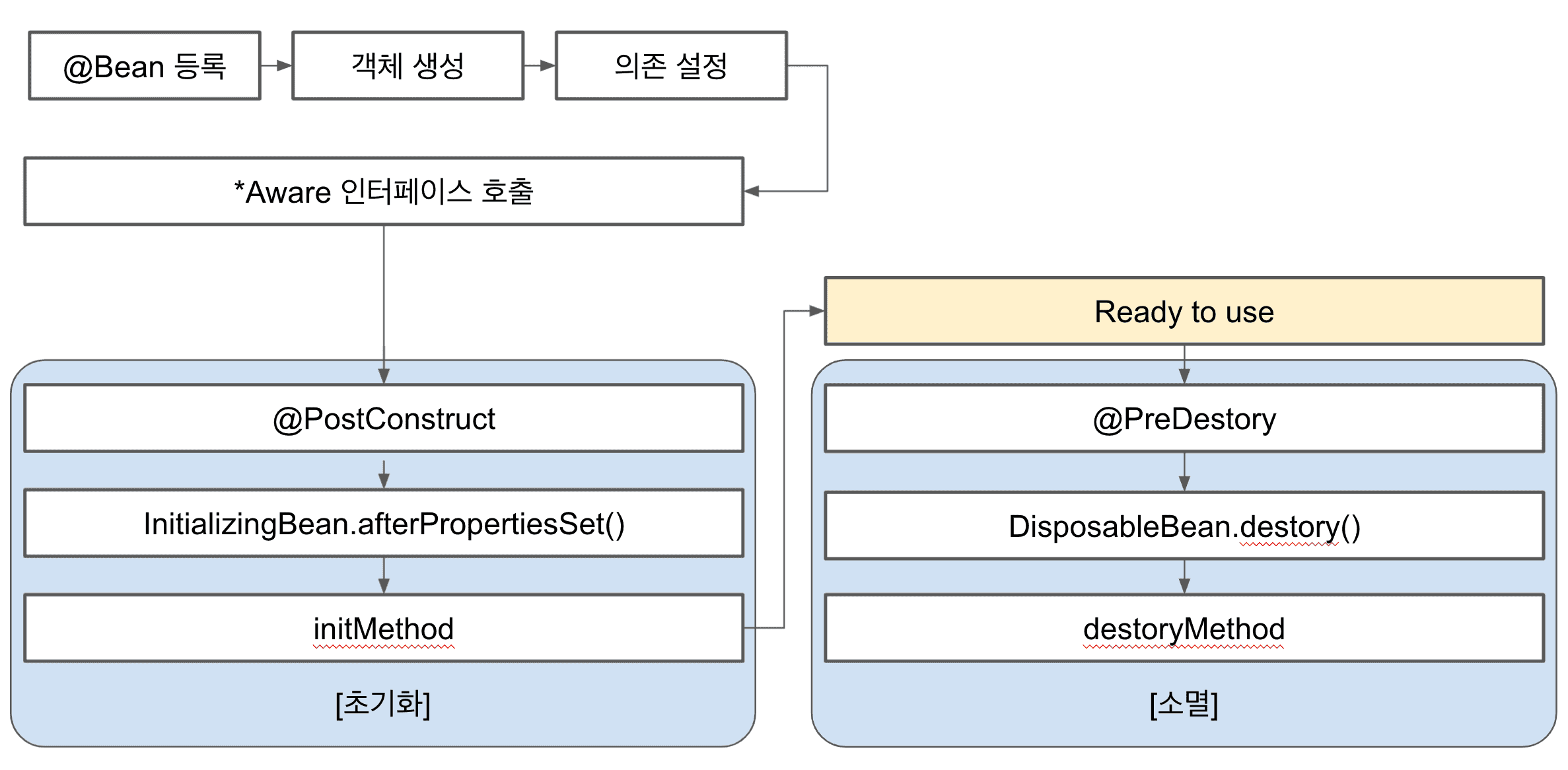 Bean이 생성되고 소멸될 때 필요한 함수를 실행하기 위해서는 상속 또는 메서드를 지정해주면 필요한 처리를 할 수 있습니다.