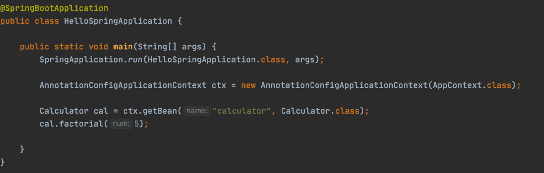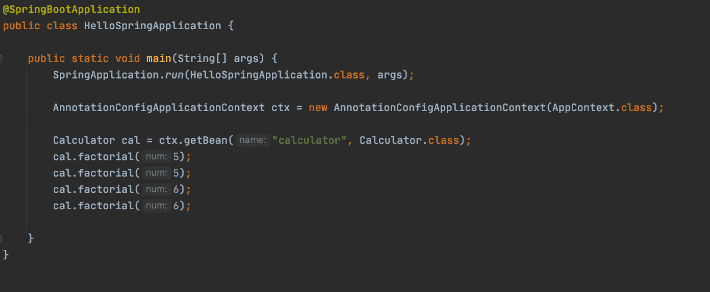 main으로가서 컨테이너 초기화 후 getBean을 통해 calculator을 가져온 후 factorial을 호출해봅니다.
