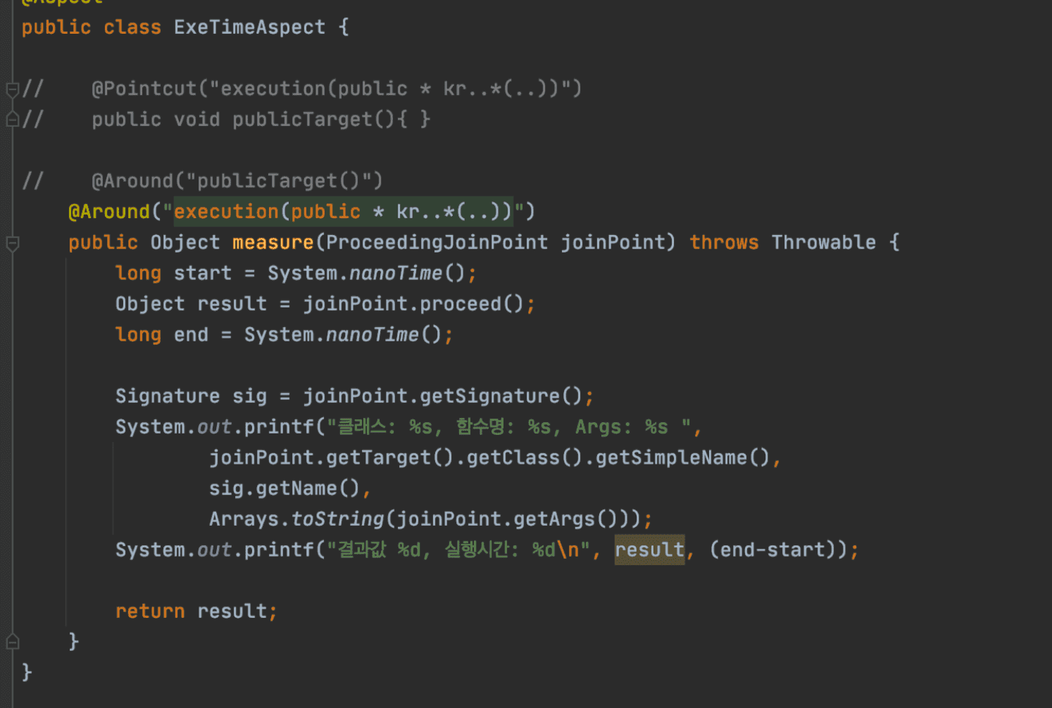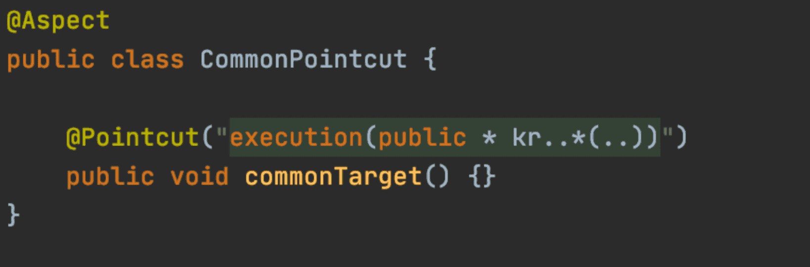 publicTarget() 의 @Pointcut으로는 사진과 같이 execution(public * kr..*(..))")으로 작성하였습니다. (뒤에가서 자세히 설명하겠습니다.)