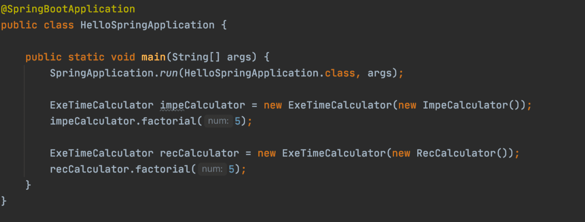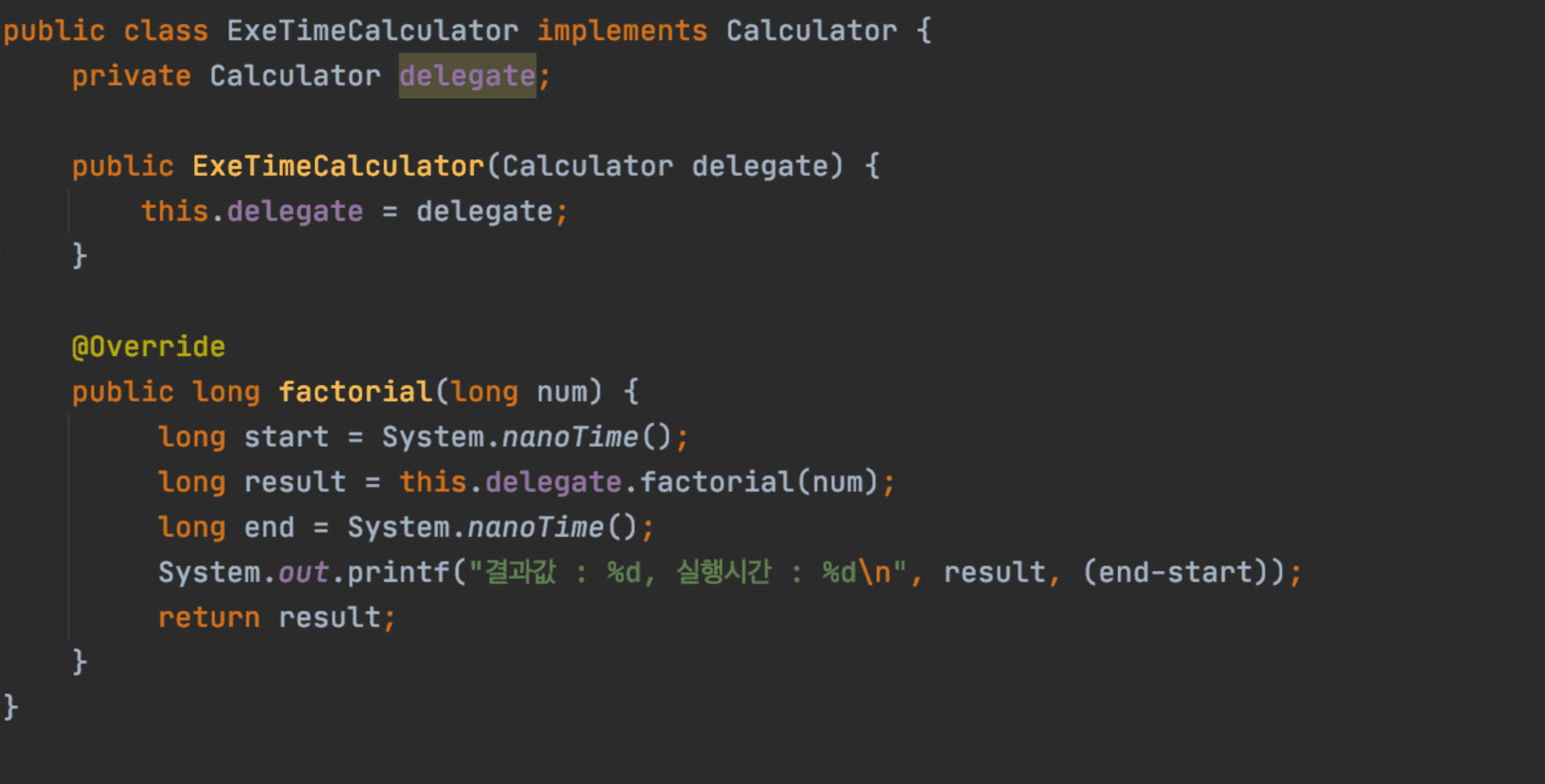 생성자로 Calculator를 넘겨받아 delegate라는 이름으로 저장해주고, factoral을 재정의하여 시간 측정하는 코드를 작성합니다.