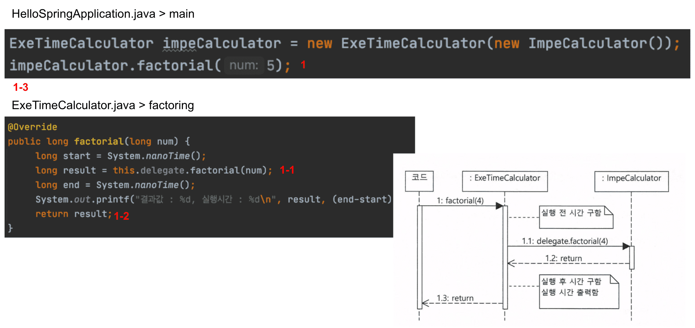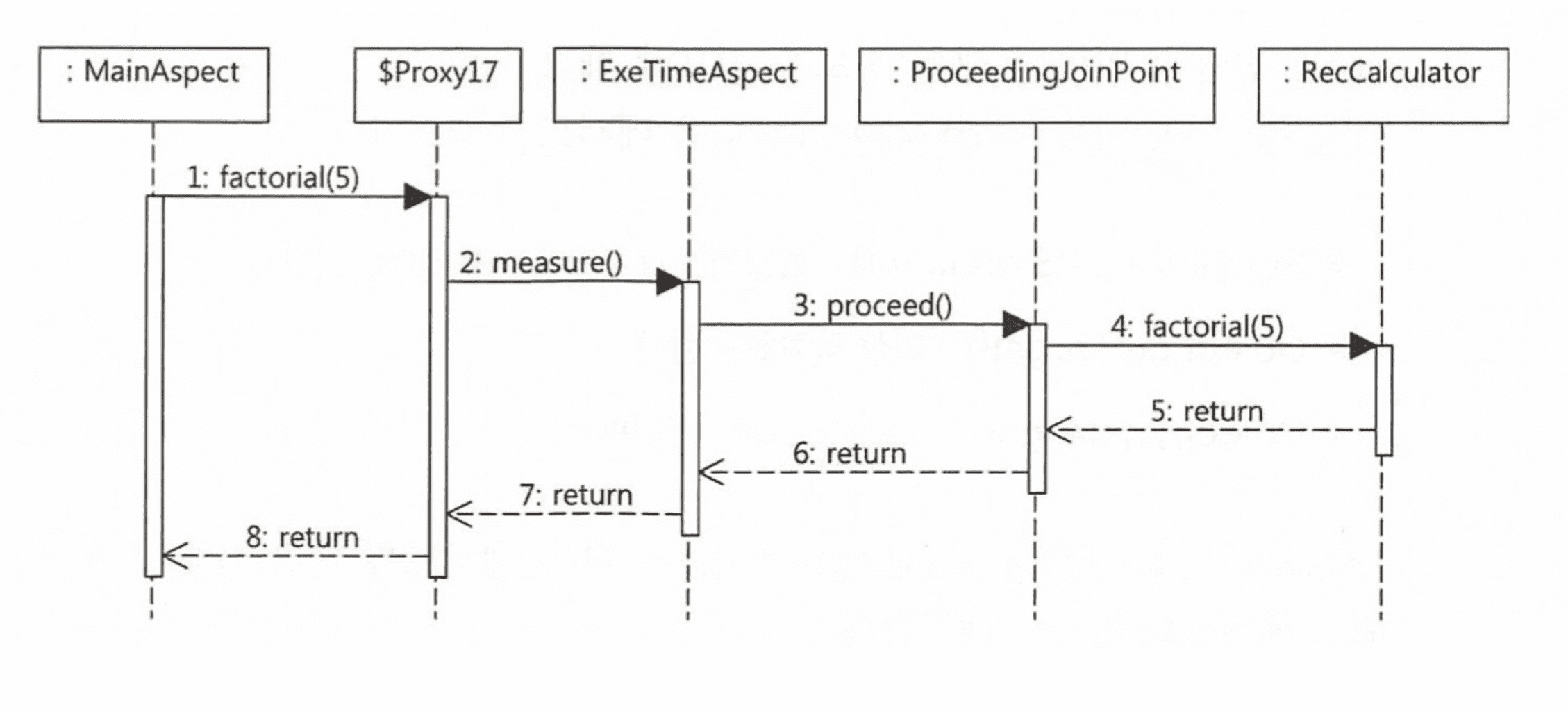 - main에서 factorial을 실행하면 그것을 Proxy가 받아 ExeTimeAspect의 measure를 실행합니다.