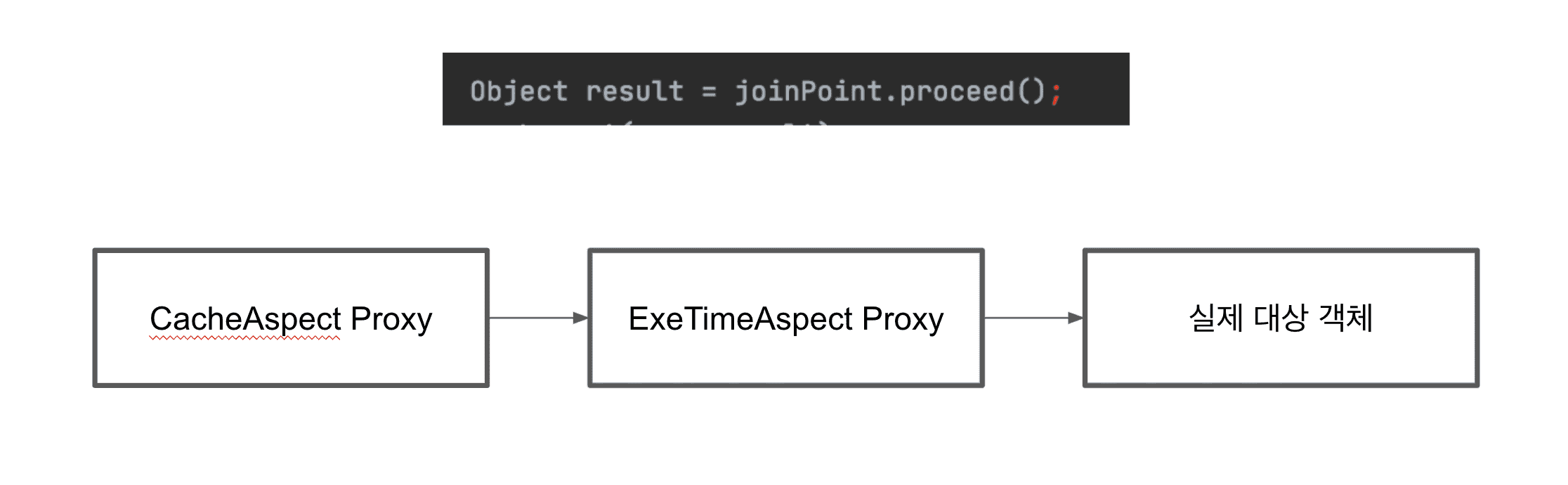위에서 joinPoint.proceed() 를 호출하면 실제 대상 객체의 메서드가 실행된다고 설명했었지만, Aspect가 두개가 실행되면서 CacheAspect가 바라보는 실제 대상 객체가 Calculator가 아닌 ExeTimeAspect가 되었습니다.
