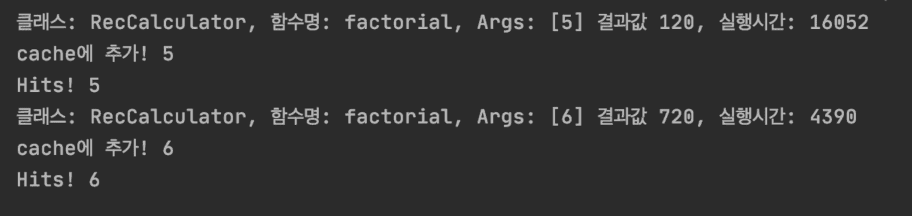 factorial(5) 호출-> 캐시에 존재하지 않아 실제 대상 객체를 호출하여 결과값을 구한 뒤 cache에 추가 출력factorial(5) 호출-> 캐시에 존재하여 cache에서 값을 찾았고 hits 출력factorial(6) 호출-> 캐시에 존재하지 않아 실제 대상 객체를 호출하여 결과값을 구한 뒤 cache에 추가 출력factorial(6) 호출-> 캐시에 존재하여 cache에서 값을 찾았고 hits 출력