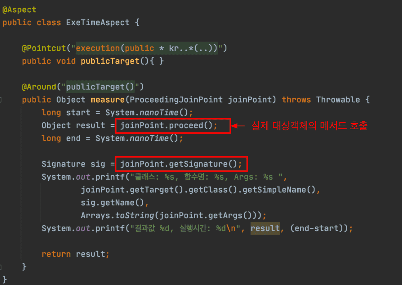 그리고 joinPoint.proceed()를 통해 메서드를 호출합니다. 위에서 설명드렸던 것처럼 Spring AOP는 메서드 호출에 대한 Aspect만 지원합니다.
