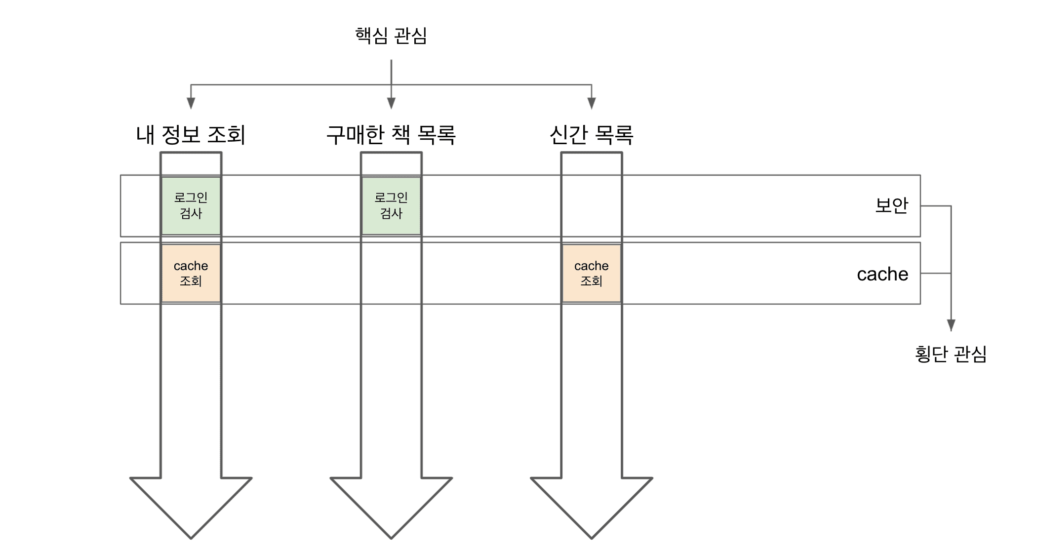 이렇게 횡단 관심으로 처리할 작업들에는 보안, 캐시, db 커넥션 관리, 로깅 등이 있을 수 있습니다.