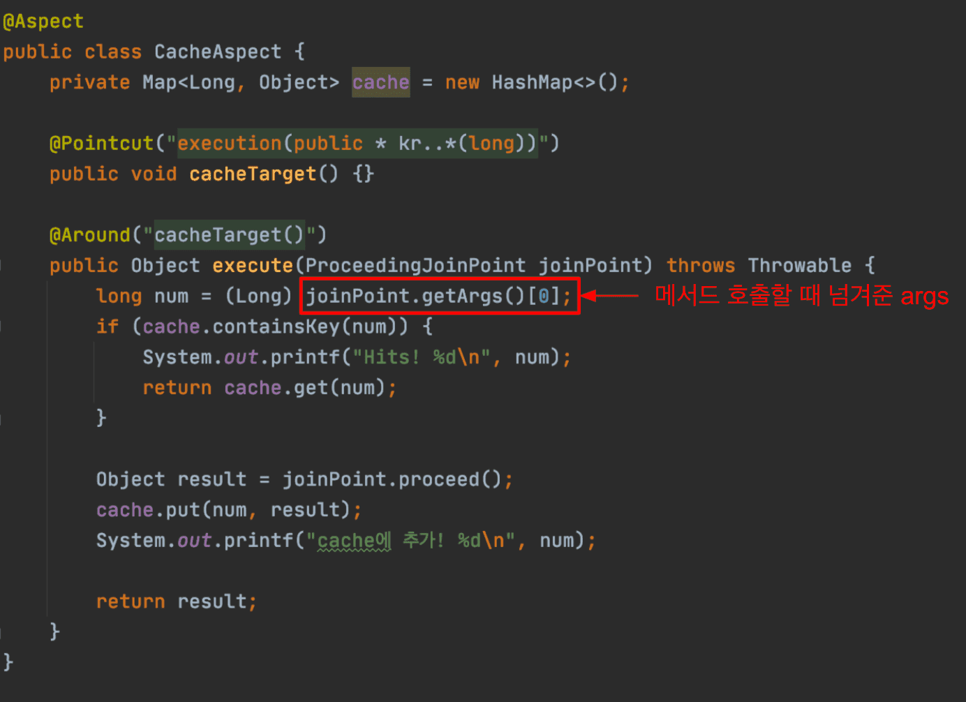 joinPoint.getArgs()[0]을 통해 메서드로 넘겨준 args를 가져옵니다.- Map타입의 cache안에 해당 결과값이 있는지 검사합니다.