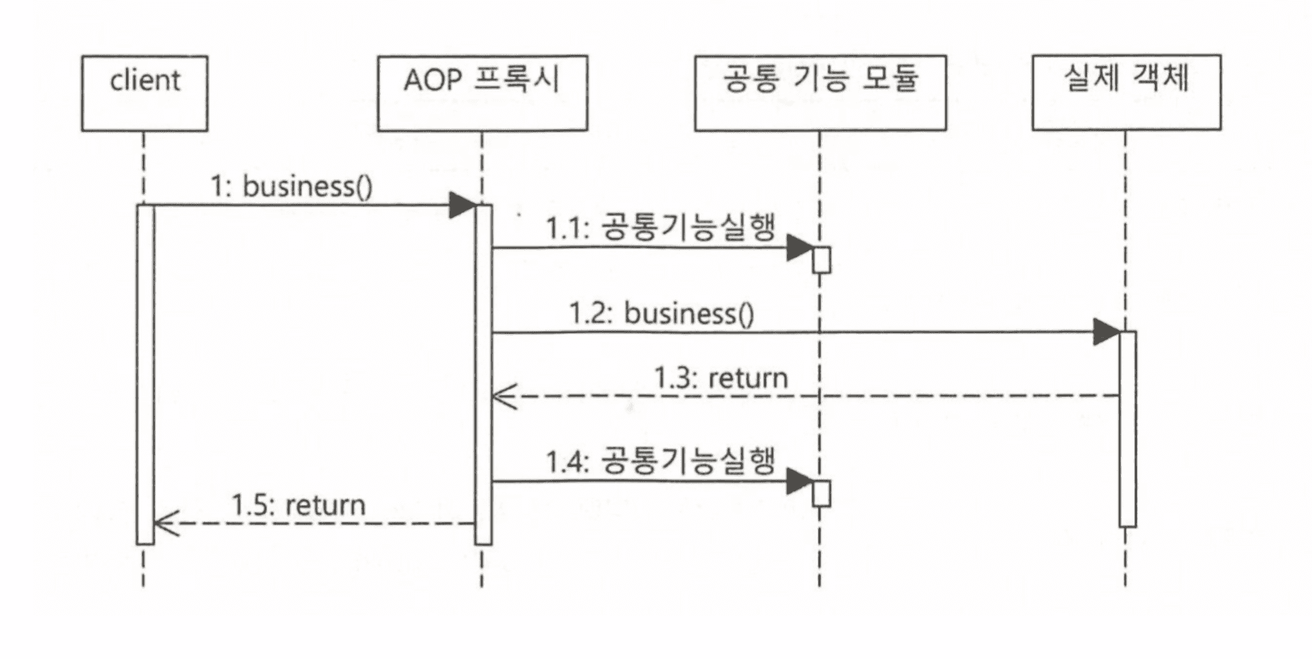 client가 business()를 호출하면 그것은 AOP프록시가 넘겨받아 공통 기능을 실행한 후 핵심기능의 business()를 호출합니다.