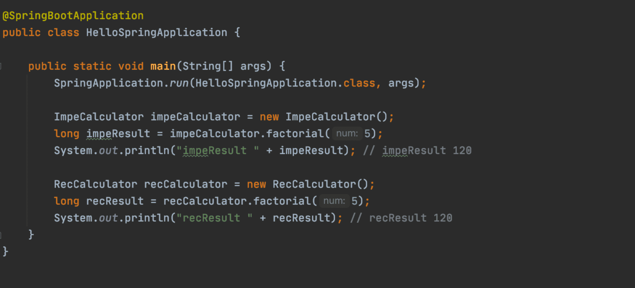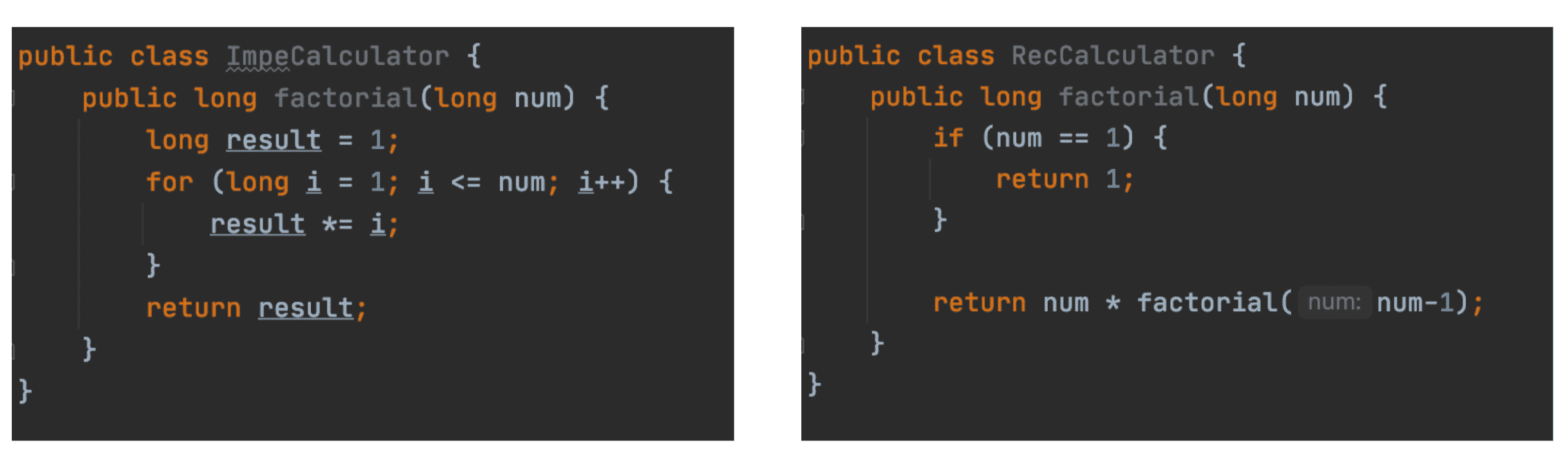 ImpeCalculator는 long타입의 num변수를 넘겨받아 factorial을 계산합니다. 계산방법으로는 for문을 이용해 순차적으로 계산합니다.