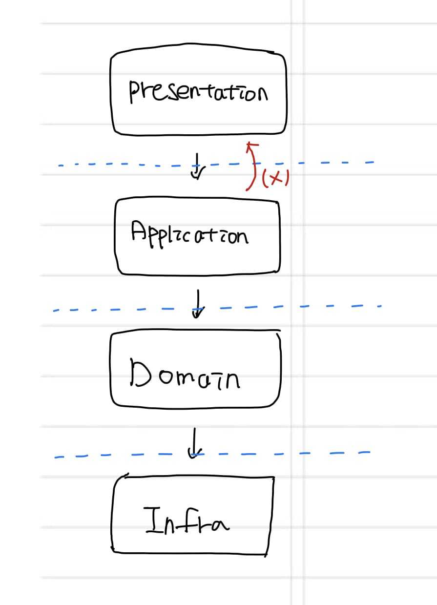 화살표의 방향이 그려진 것 처럼 상위에서는 하위 Layer를 참조하지만(Dependency가 있지만) 하위에서 상위 Layer를 참조할 수 없다. (일방향)