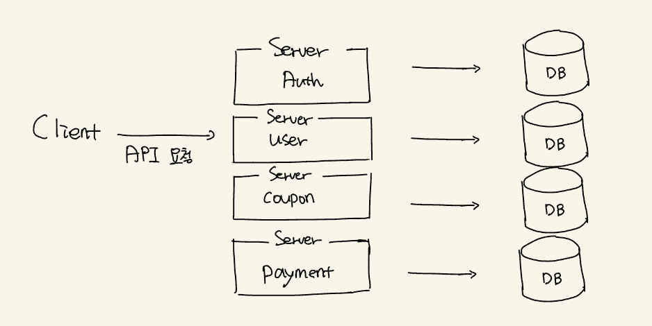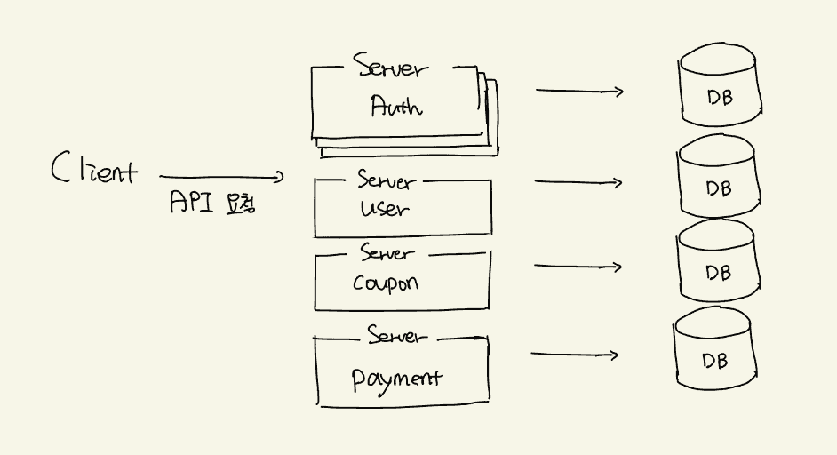 즉 각각의 서버는 자신의 도메인 로직 처리만을 담당하고 각각 DB를 따로 관리한다.