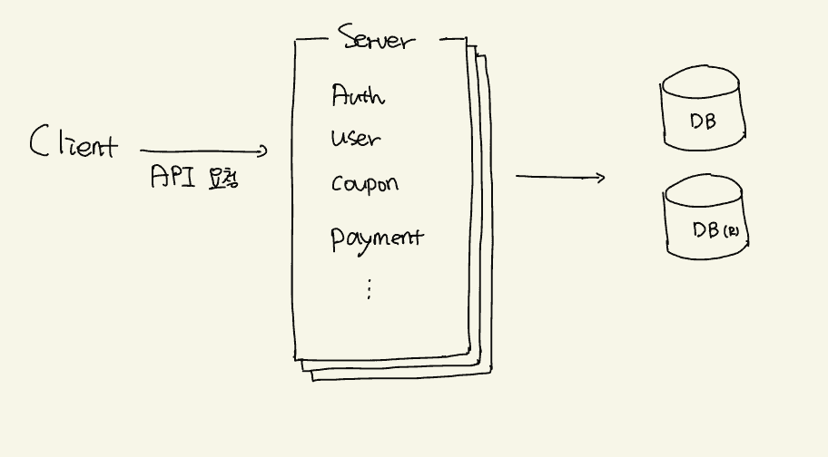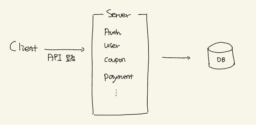 MSA를 하기 전의 대부분의 많은 프로젝트는 모놀리식 아키텍처 형태의 구조를 띄고 있다. 하나의 서버에 인증부터 모든 서비스 모듈을 담고 있는 경우라고 생각하면 된다.
