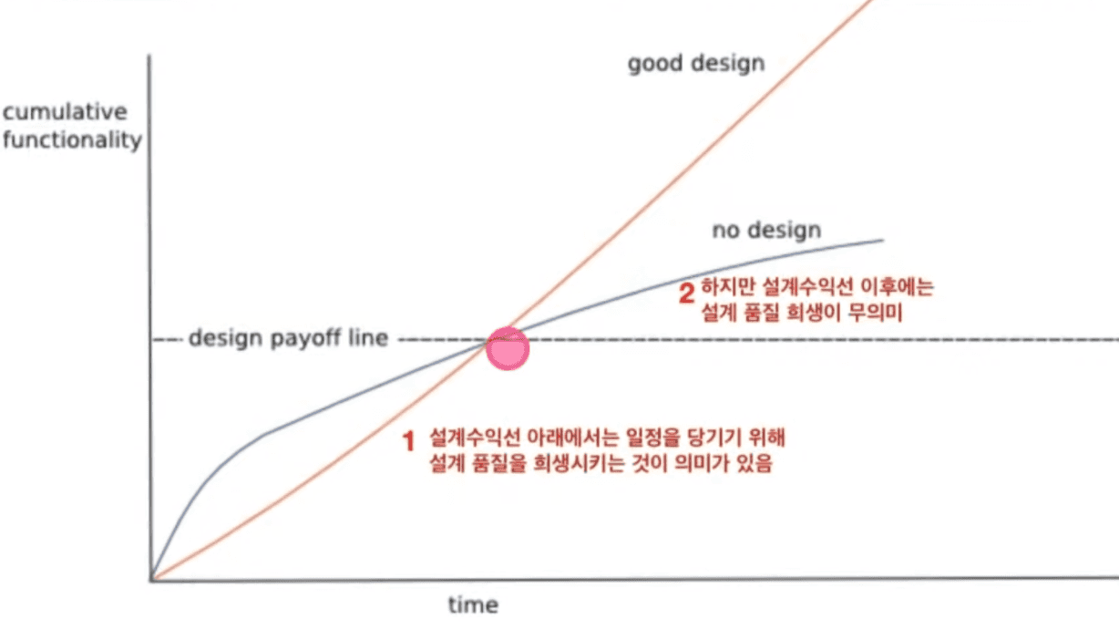 즉, 일정이 급하다는 이유로 설계를 희생시킬 수 있으니 프로젝트가 점점 커지고 장기적으로 봤을 때 이는 극명한 차이를 드러낸다.