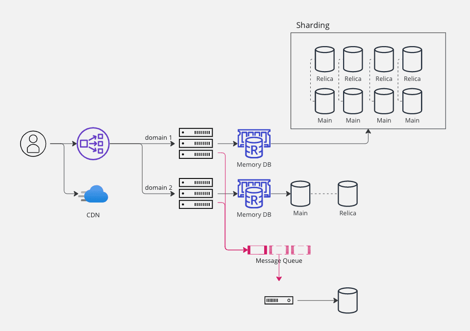 도메인을 더 작게 나누어 데이터를 더 분산시키는 방법도 있겠지만, 데이터베이스에 데이터를 저장할 때 저장하는 방법에 대한 구조를 변경하는 방법인 샤딩이 있다.