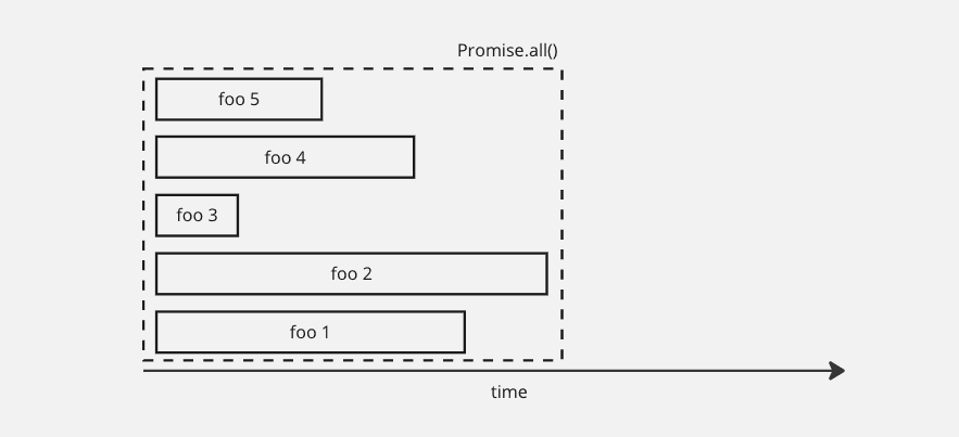 await Promise.all([foo(), foo(), foo(), ...]);여기서 일어나는 일을 상상해본다면, Promise.all 을 통해 foo 함수는 비동기를 통해 병렬로 실행되며, 타임라인은 아래와 같다.