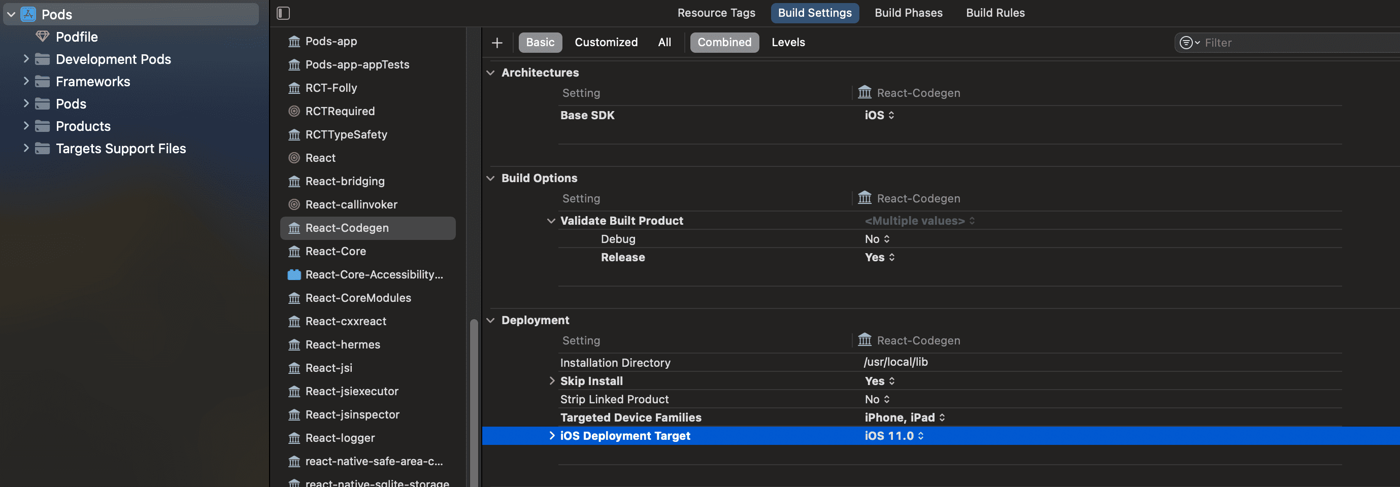 아래 경로로 가보면 IOS 타겟이 ios 11 로 되어있는데,