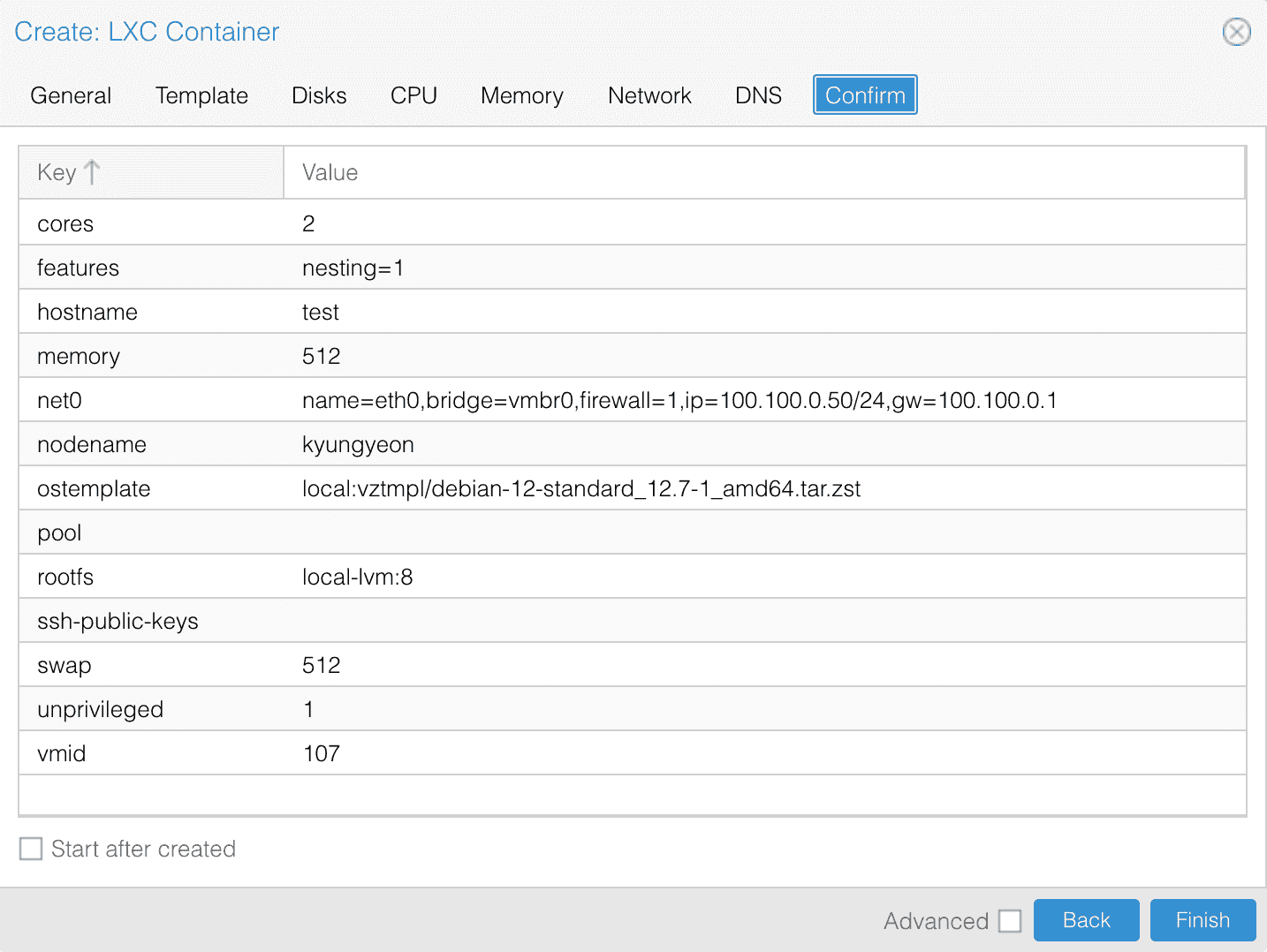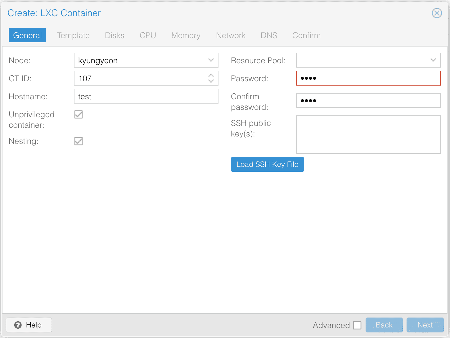 CT ID, Hostname 은 필요에 따라 설정하면 좋다. OS 비밀번호를 설정하자.